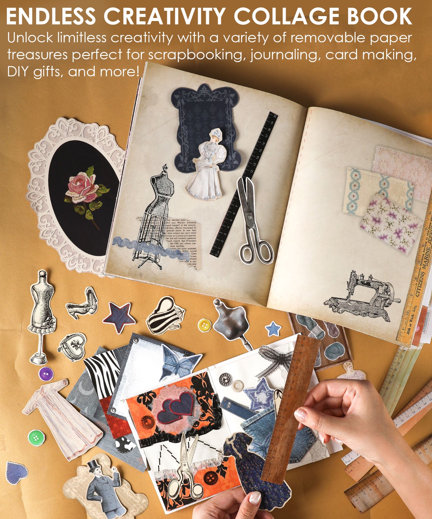 Immerse yourself in an artistic realm where fabric and heritage intertwine with this luxuriously thick collage book! Featuring 200+ pages of diverse premium papers and a curated textile-inspired collection, we invite you on a captivating journey themed "Threads of Time" – unlocking infinite possibilities for collage, journaling, and timeless creative delight!