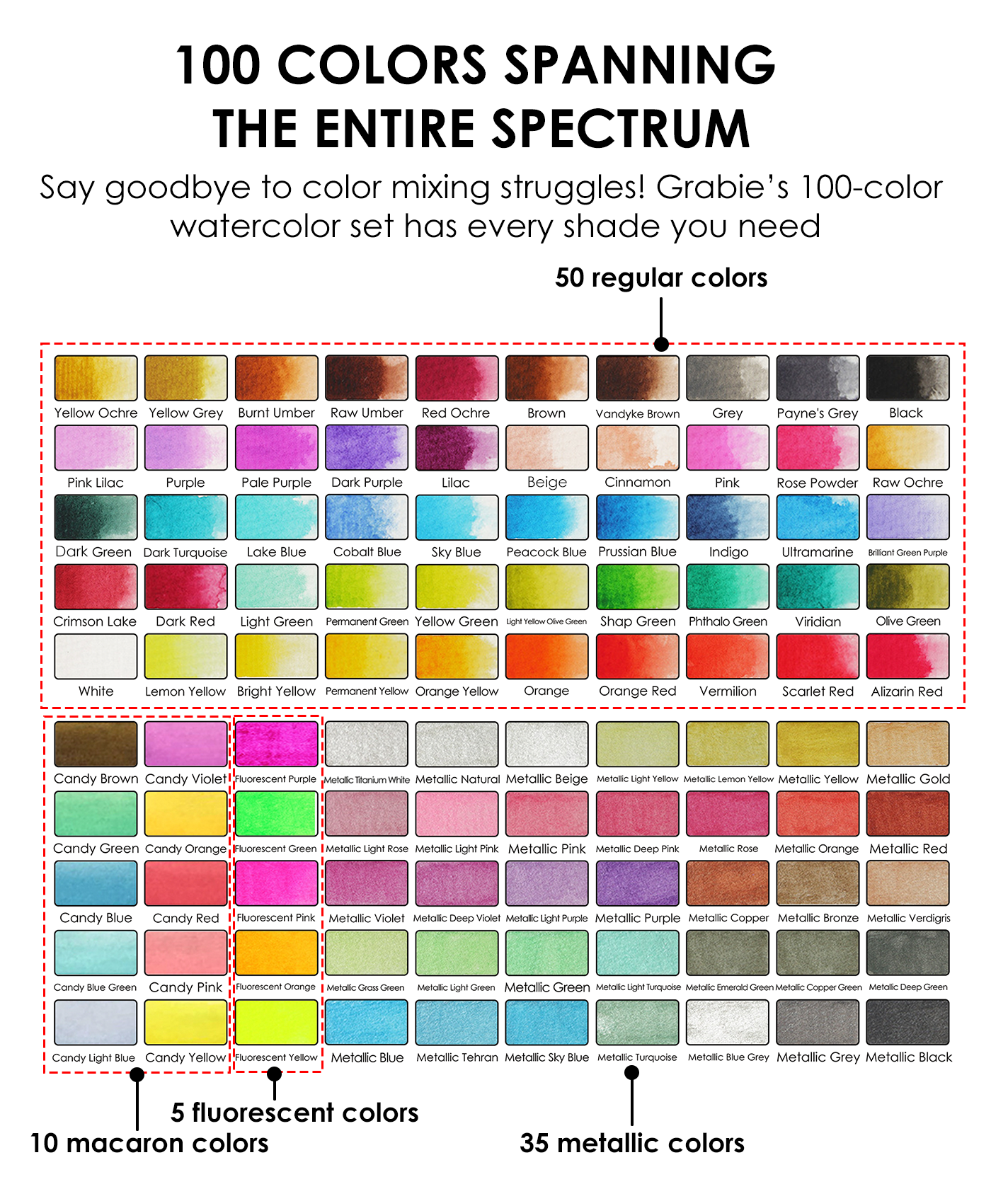 Grabie watercolor paint set of 100 colors including 50 regular watercolors, and the amazing metallic, macaron, and fluorescent watercolors, features high-quality artist-grade watercolors that blend easily and offer many color options to save you time from having to blend custom colors. With 100 different watercolor paints to choose from, let your imagination run wild.