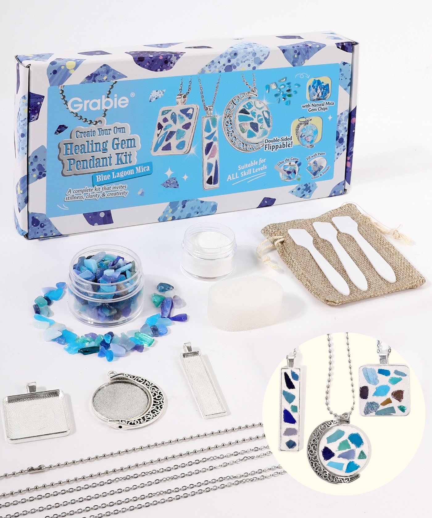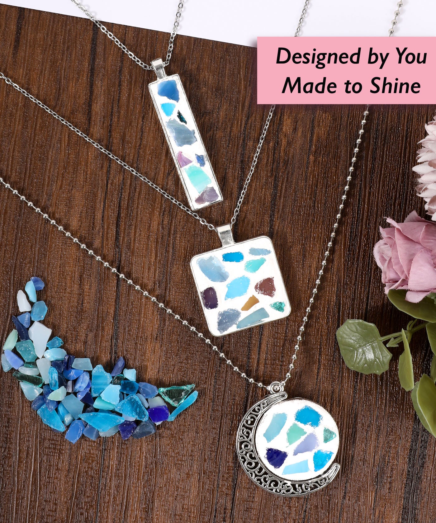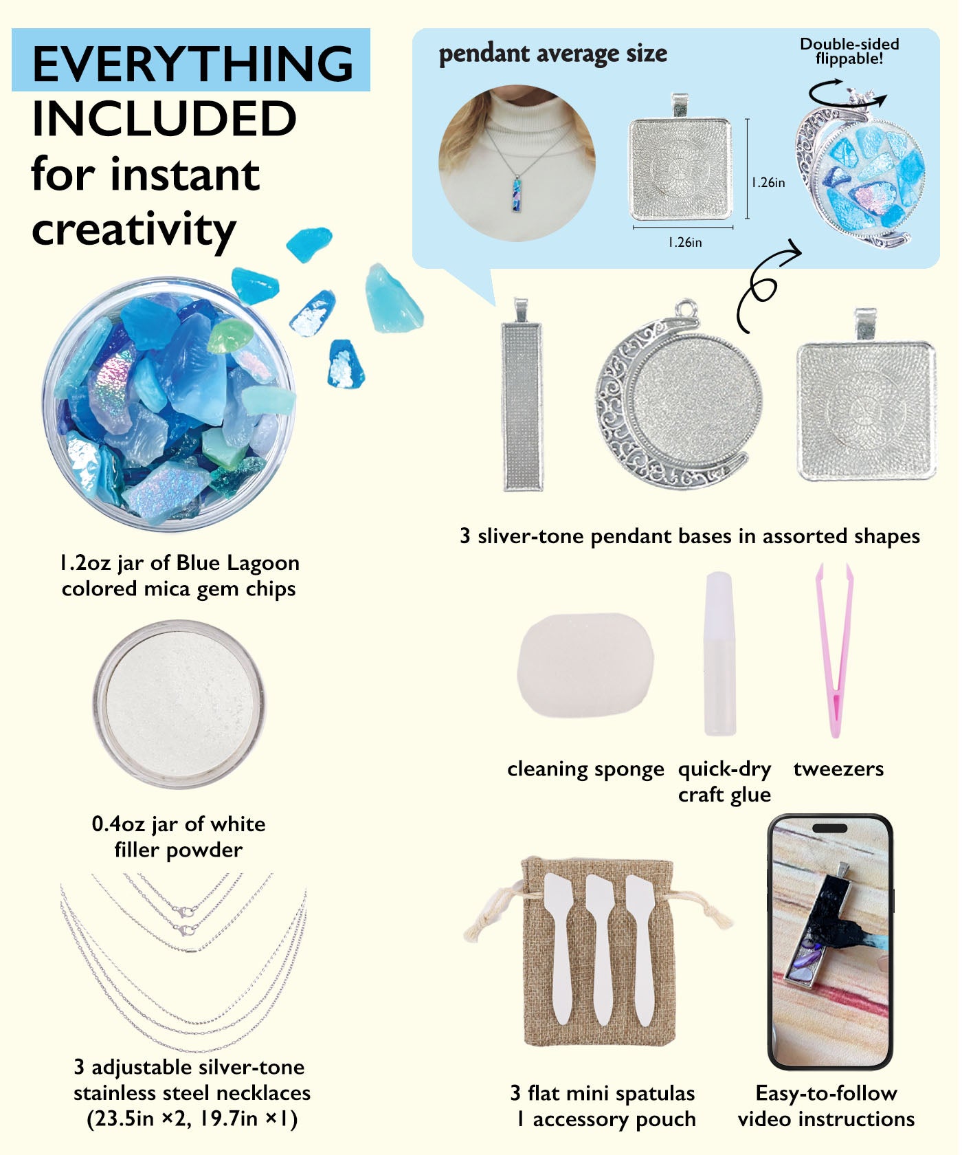 - ALL-IN-ONE COMPLETE SET — This kit includes everything you need to make three pendants: 1.2oz jar of Blue Lagoon colored mica gem chips, 3 sliver-tone pendant bases in assorted shapes, 3 adjustable silver-tone stainless steel necklaces (23.5in ×2, 19.7in ×1), 0.4oz jar of filler powder, 3 flat mini spatulas, 1 quick-dry craft glue, 1 cleaning sponge and tweezers. No extra tools required — open the box and start creating!