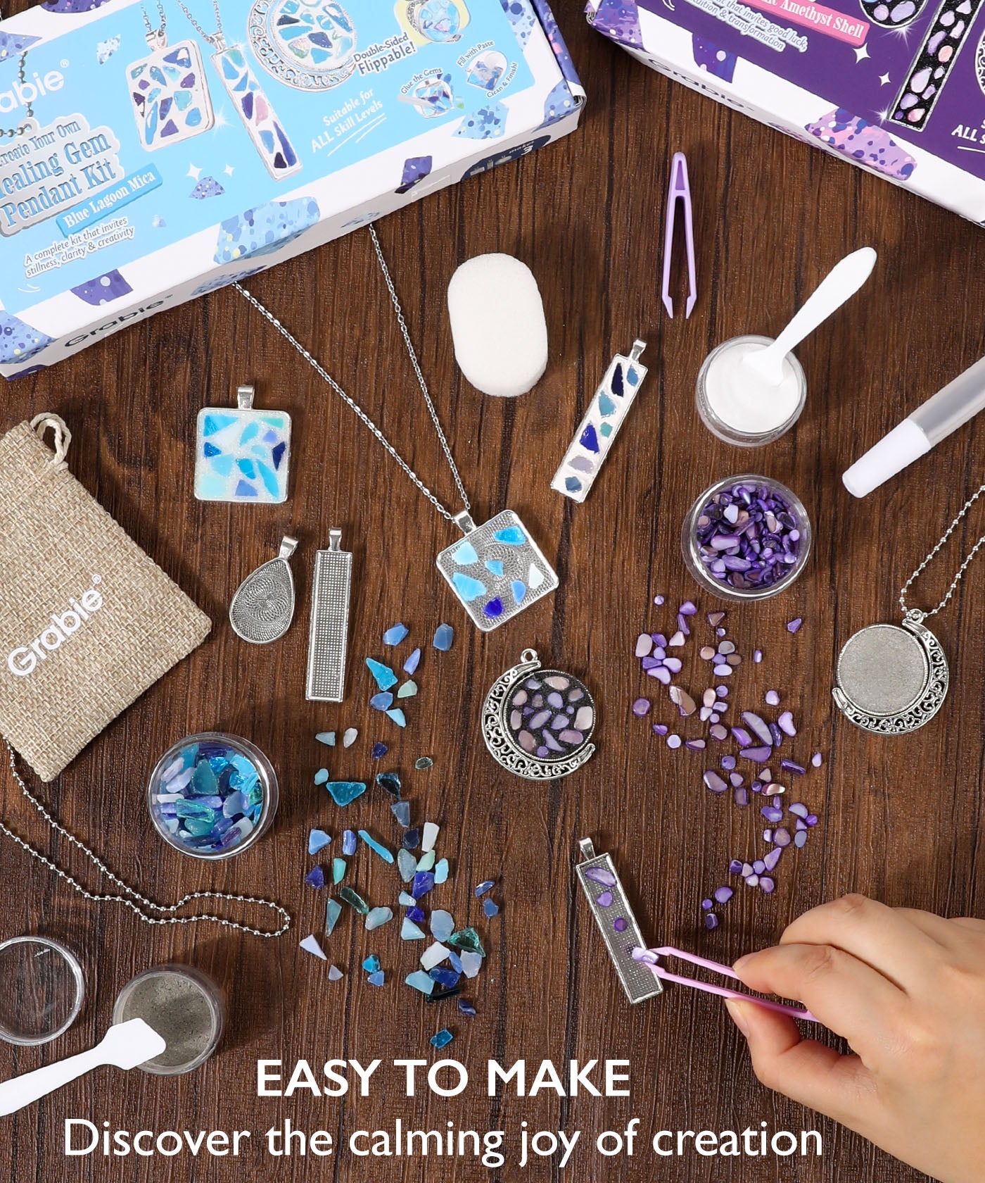 - ALL-IN-ONE COMPLETE BUNDLE SET — Better value, more creations with everything included. This bundle combines two full kits, giving you everything needed to make six pendants: 1.2 oz jar of Blue Lagoon-colored mica gem chips, 1.2 oz jar of Cosmic Amethyst-colored shell chips, 6 silver-tone pendant bases in assorted shapes, 6 adjustable silver-tone stainless steel necklaces (23.5 in ×4, 19.7 in ×2), 0.8 oz total filler powder in 2 colors, 6 flat mini spatulas, 2 quick-dry craft glues, cleaning sponges & tweezers. No extra tools required — open the box and start creating!