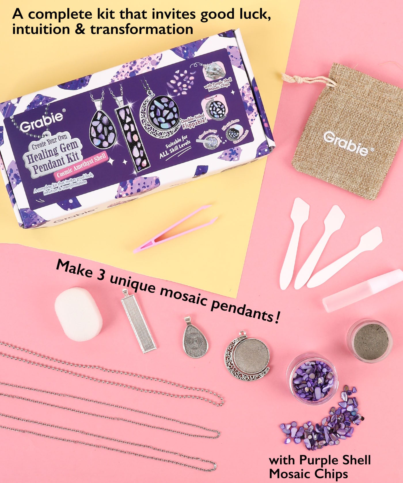 - MYSTIC SHELL ENERGY - Using iridescent purple shell chips, you’ll design 3 unique mosaic pendants that glow with mystery and intention. Inspired by cosmic violet hues, this kit symbolizes intuition, wish-making energy, and positive transformation. The shell pieces catch sunlight beautifully, reflecting a shifting, magical shimmer that feels both calming and powerful.