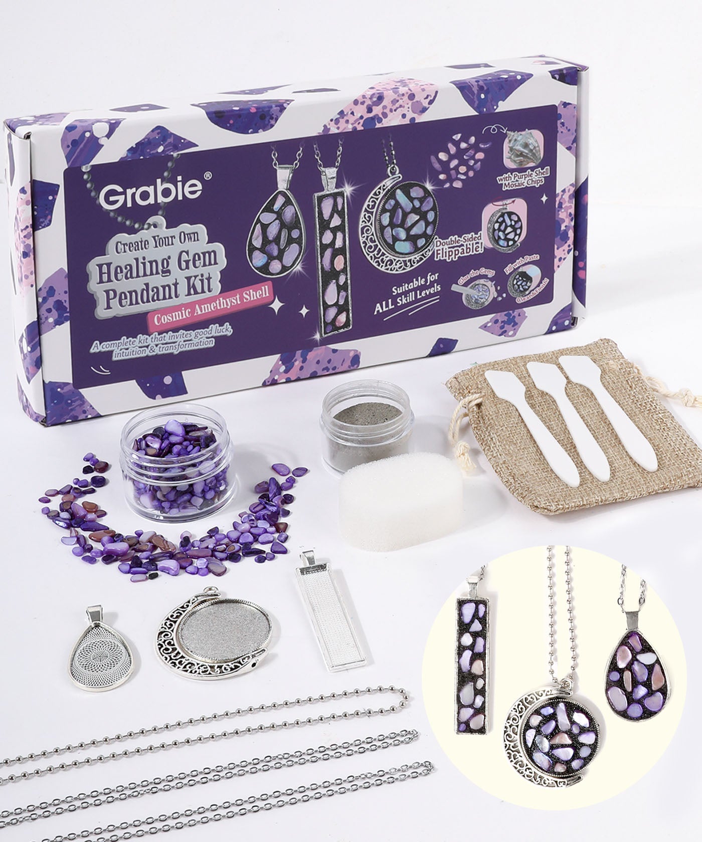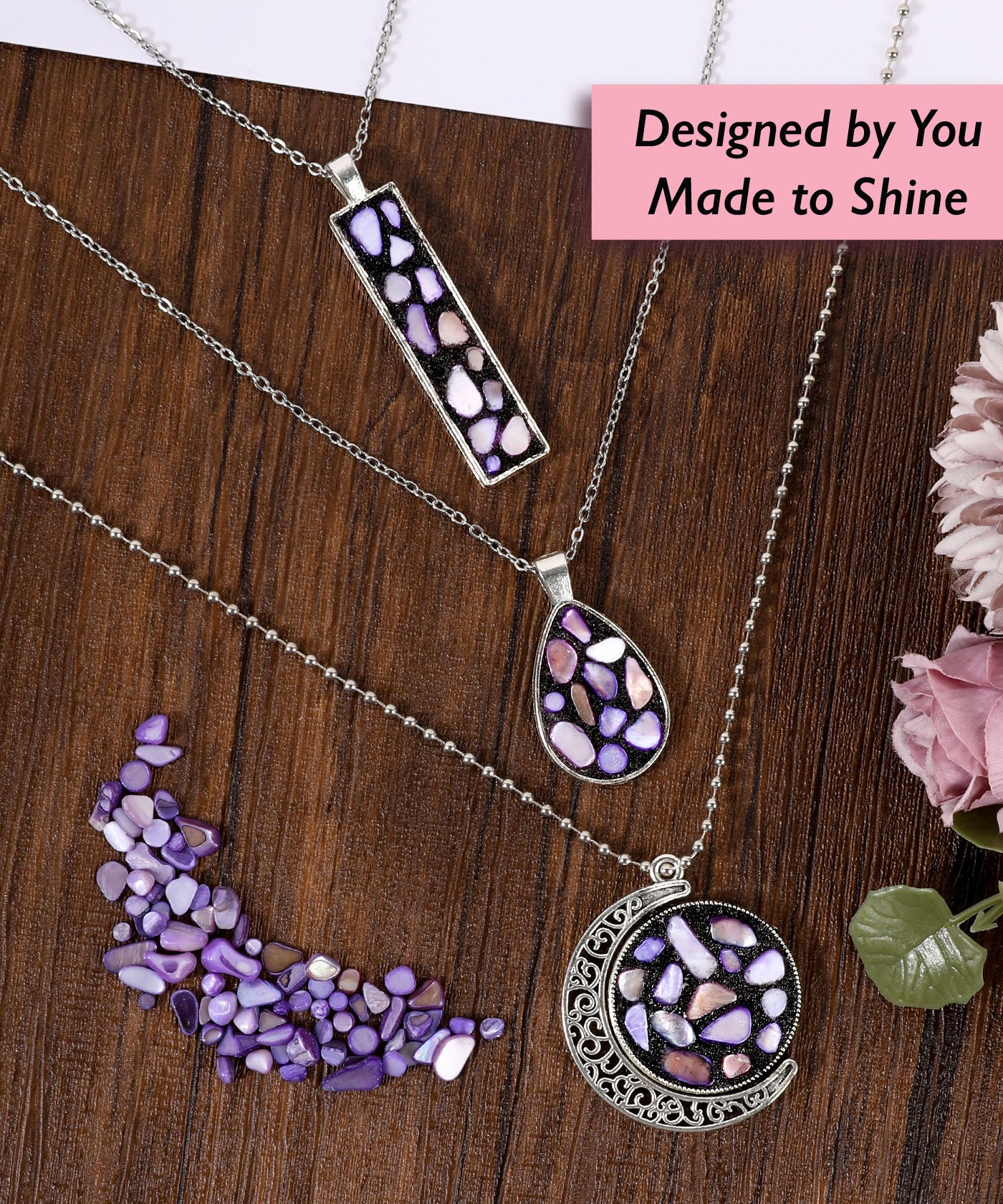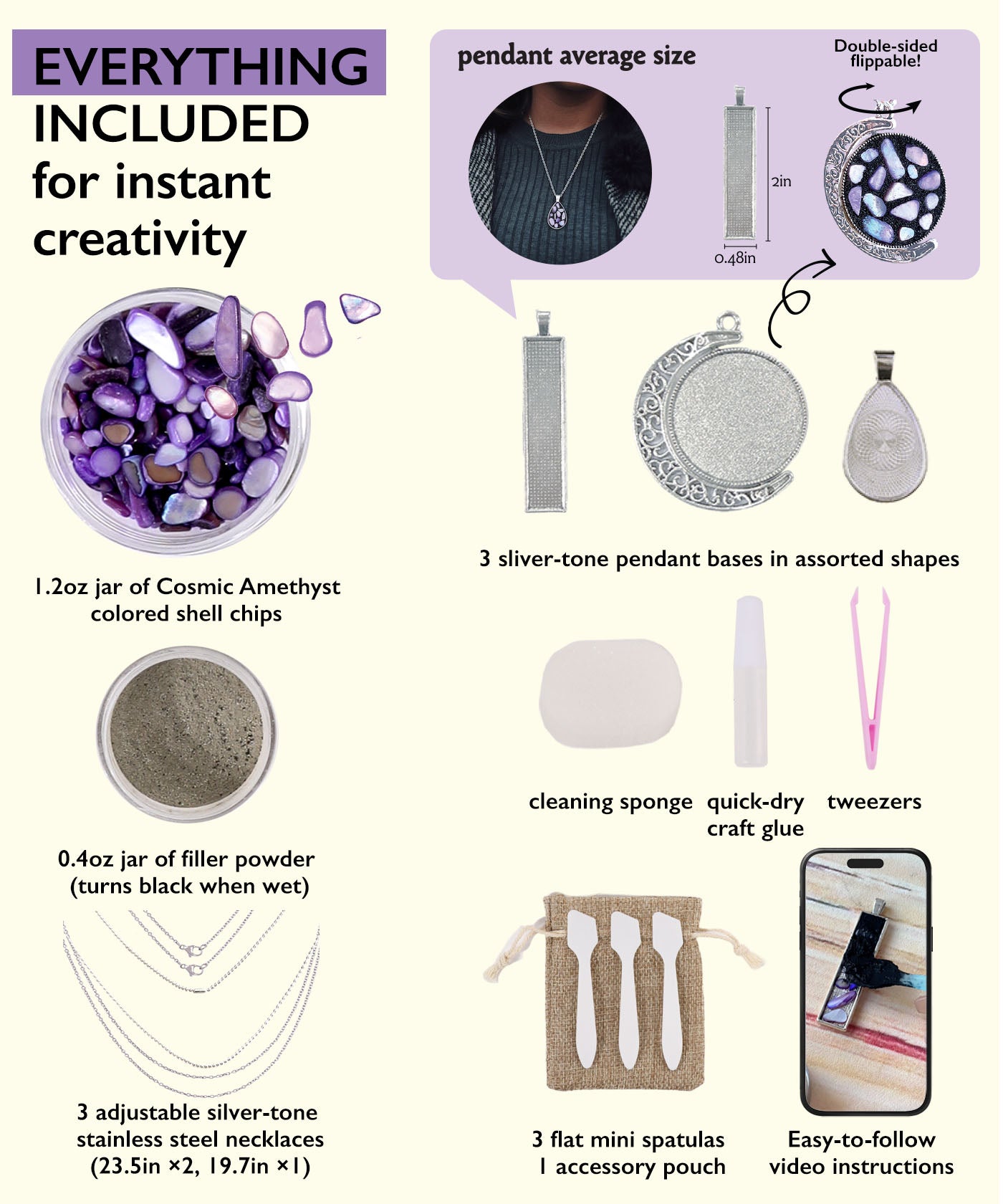 - ALL-IN-ONE COMPLETE SET — This kit includes everything you need to make three pendants: 1.2oz jar of Cosmic Amethyst colored shell chips, 3 sliver-tone pendant bases in assorted shapes, 3 adjustable silver-tone stainless steel necklaces (23.5in ×2, 19.7in ×1), 0.4oz jar of filler powder, 3 flat mini spatulas, 1 quick-dry craft glue, 1 cleaning sponge and tweezers.No extra tools required — open the box and start creating!