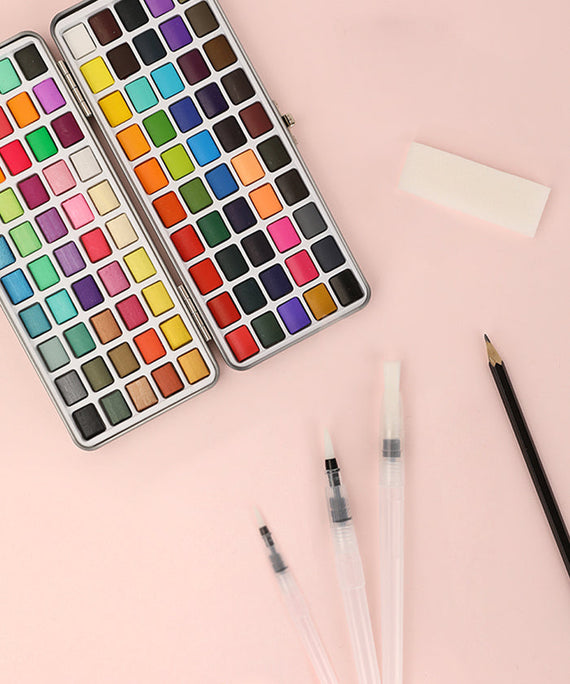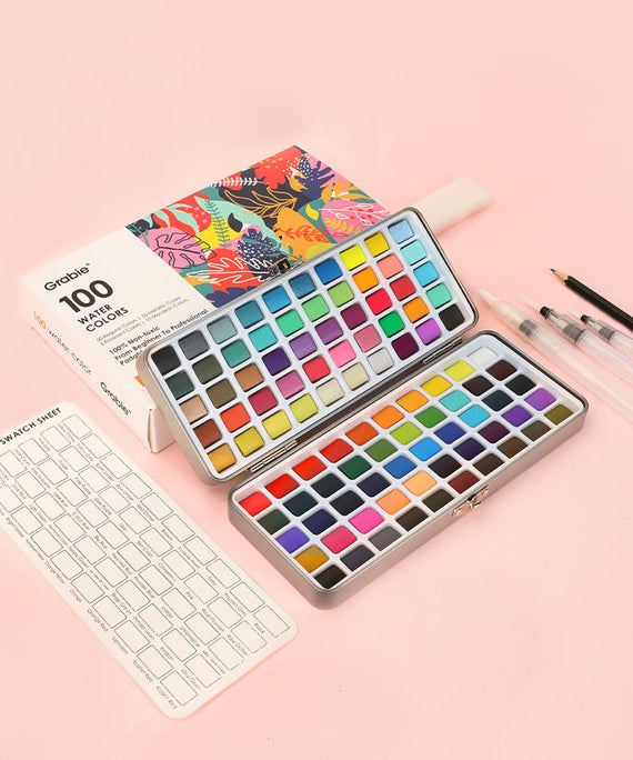 Grabie’s premium watercolor set of 100 is complete with the most comprehensive selection of watercolor accessories available anywhere. It includes three water brush pens, one drawing pencil, one natural sponge, and one swatch sheet. This set is thought out to the smallest detail, enjoy your creativity wherever you are, with the Grabie watercolor pan set.