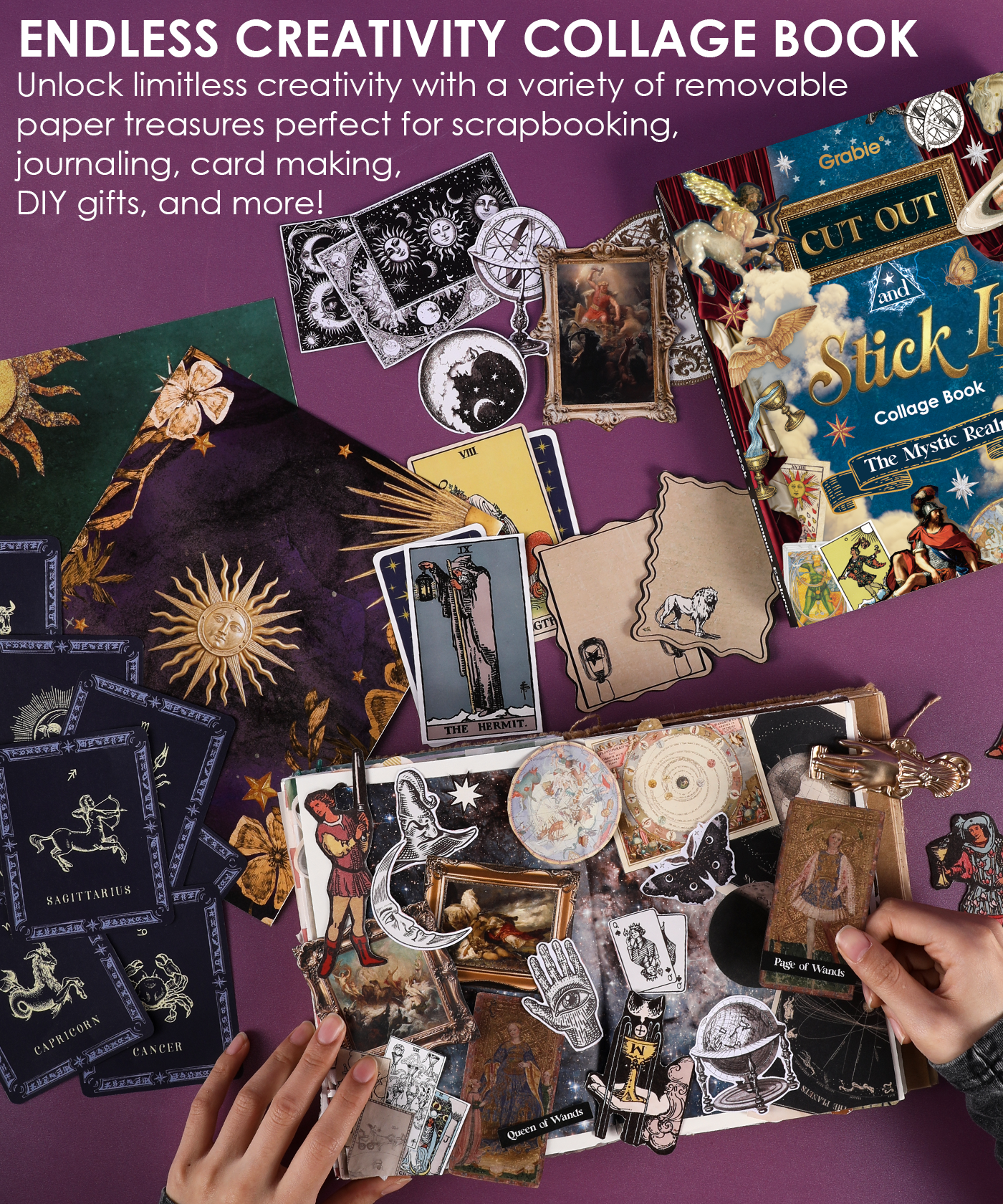 Immerse yourself in a mystical realm where myth, stars, and ancient divination intertwine with this luxuriously thick collage journal! Featuring 200+ pages of diverse premium papers and a curated collection of mythic imagery, we invite you on an enchanted journey themed “The Mystic Realm” – unlocking infinite possibilities for collage, journaling, and timeless creative delight!