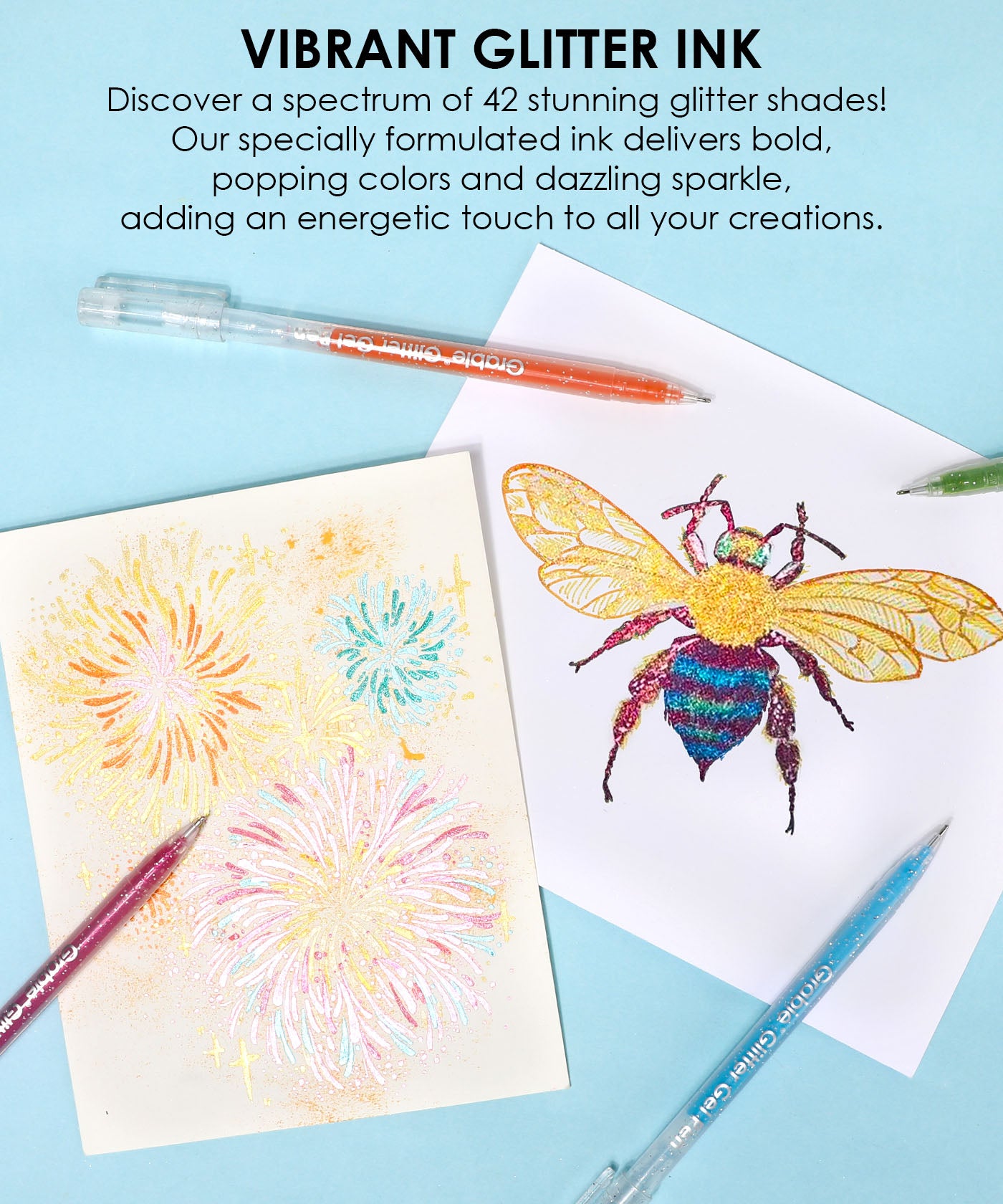- Vibrant & High-Shimmer Glitter Ink - Discover 42 unique and bold shades of glitter ink. Our new formula is specially designed to deliver popping, saturated colors and maximum sparkle, ensuring every line you create stands out vividly and dazzles the eye.