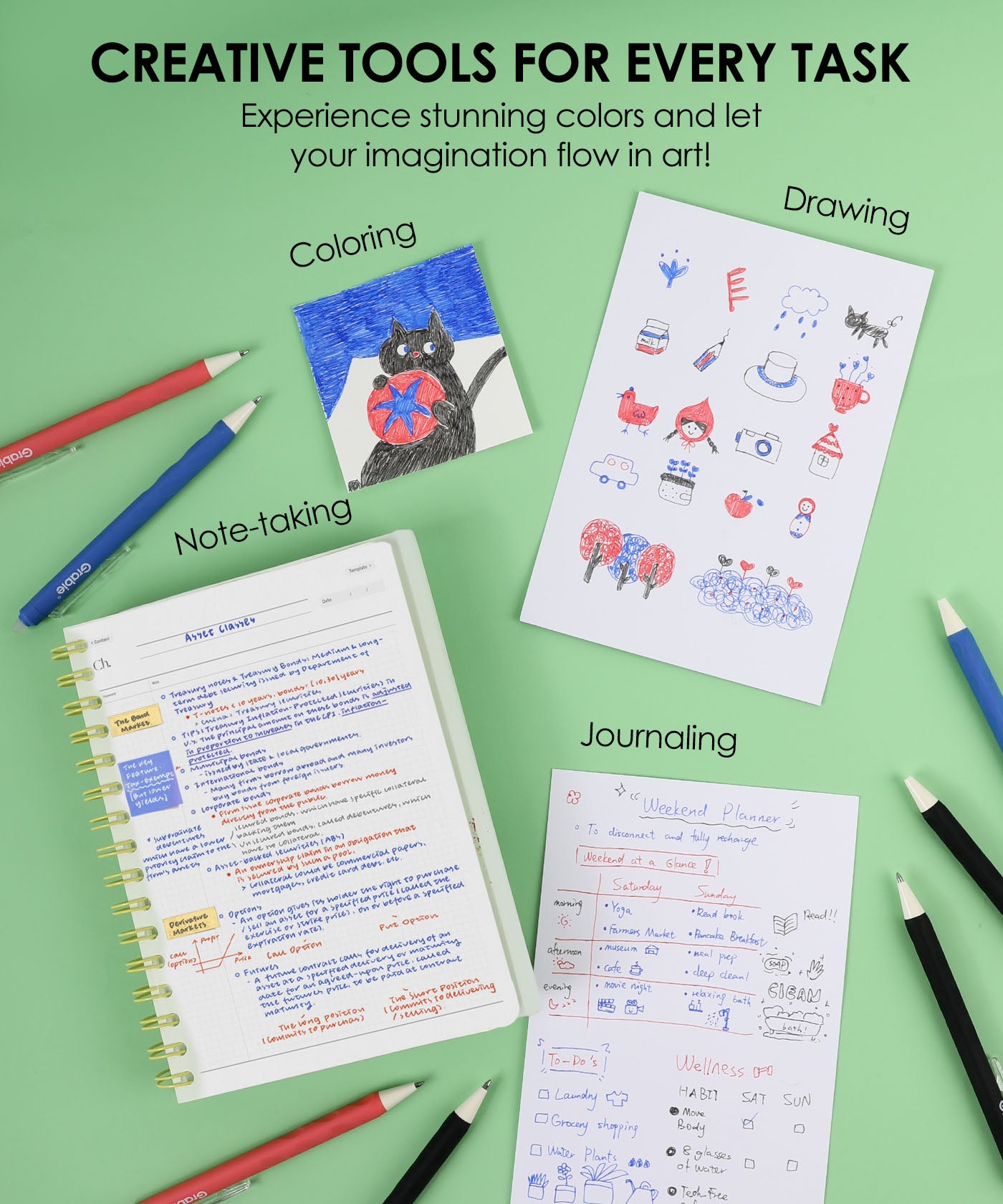 SAFE AND VERSATILE - Rest assured these pens are non-toxic and safe for all users, making them perfect for note-taking, journaling, coloring, doodling, and so much more. Whether you're at home or in the classroom, Grabie’s Medium Point Erasable Gel Pen Set is your ideal companion for all your creative endeavors. These best erasable pens are a must-have for anyone in search of journaling pens, good pens for notes, or a reliable pen for journaling.